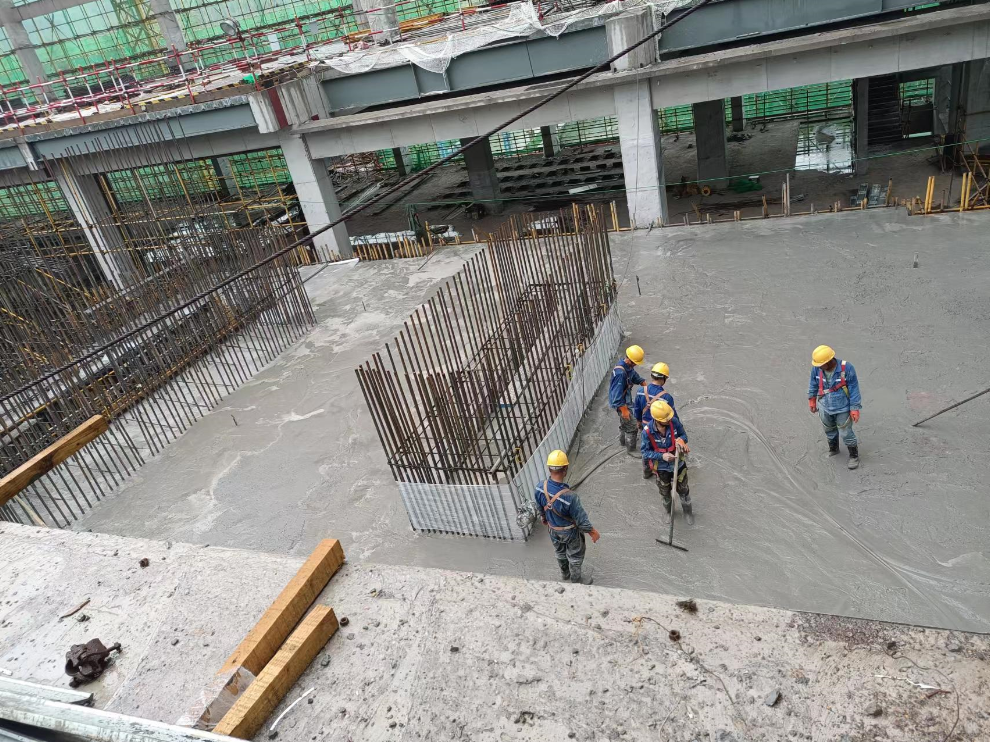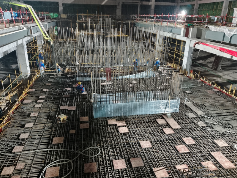燃机基础是机岛中重要的一个动力设备基础,其施工质量将直接关系到机组的安全、稳定运行。5月18日15时08分,在泵车作用下,混泥土不断注入基础内,浇筑任务正式开始。由于雨天作业,施工人员对已入仓的混凝土振捣密实后立即进行了遮盖保护措施,全力确保浇筑质量。经过连续23个小时的奋战,参建单位共浇筑1500方混凝土,浇筑任务按计划顺利完成。