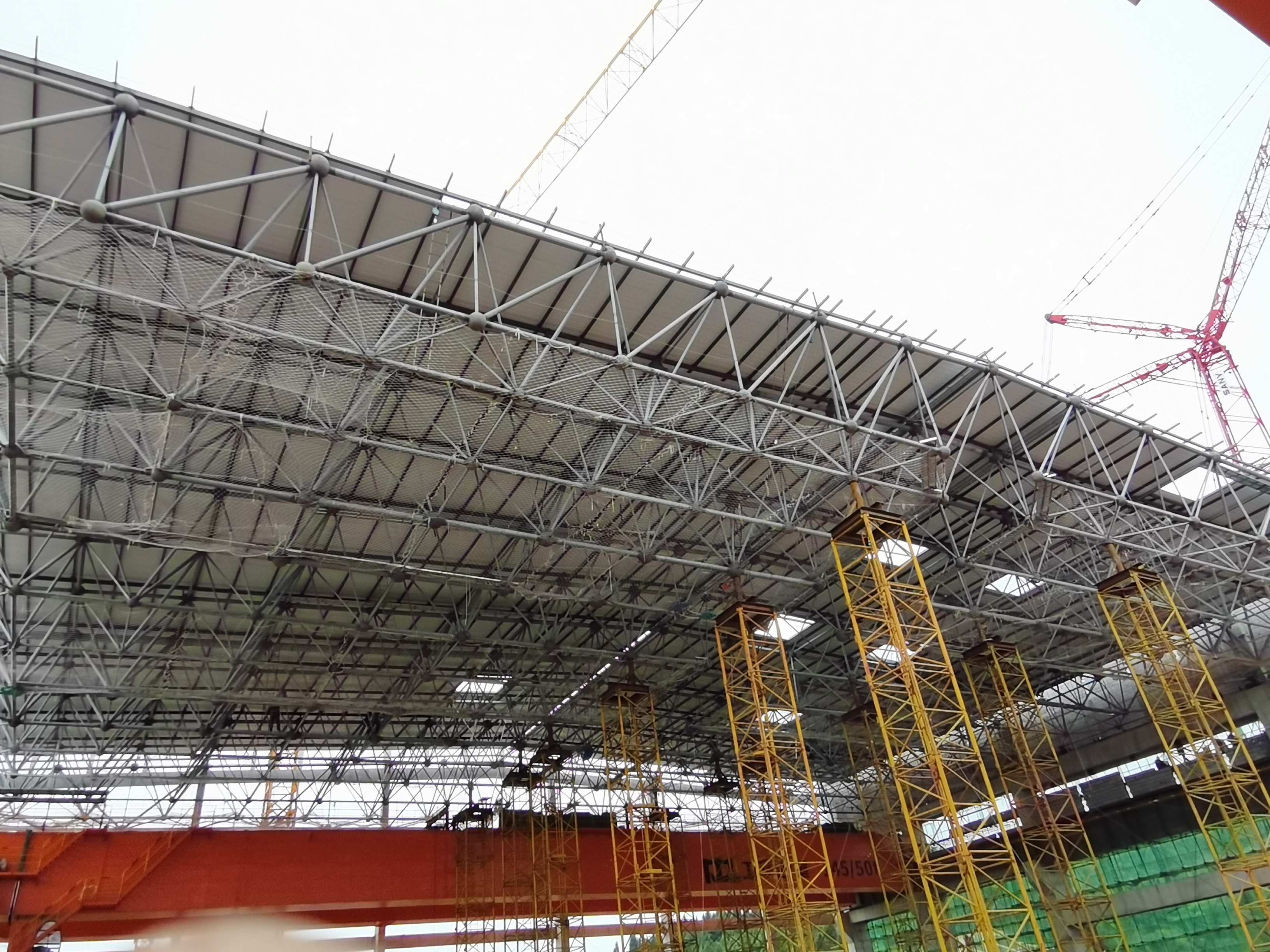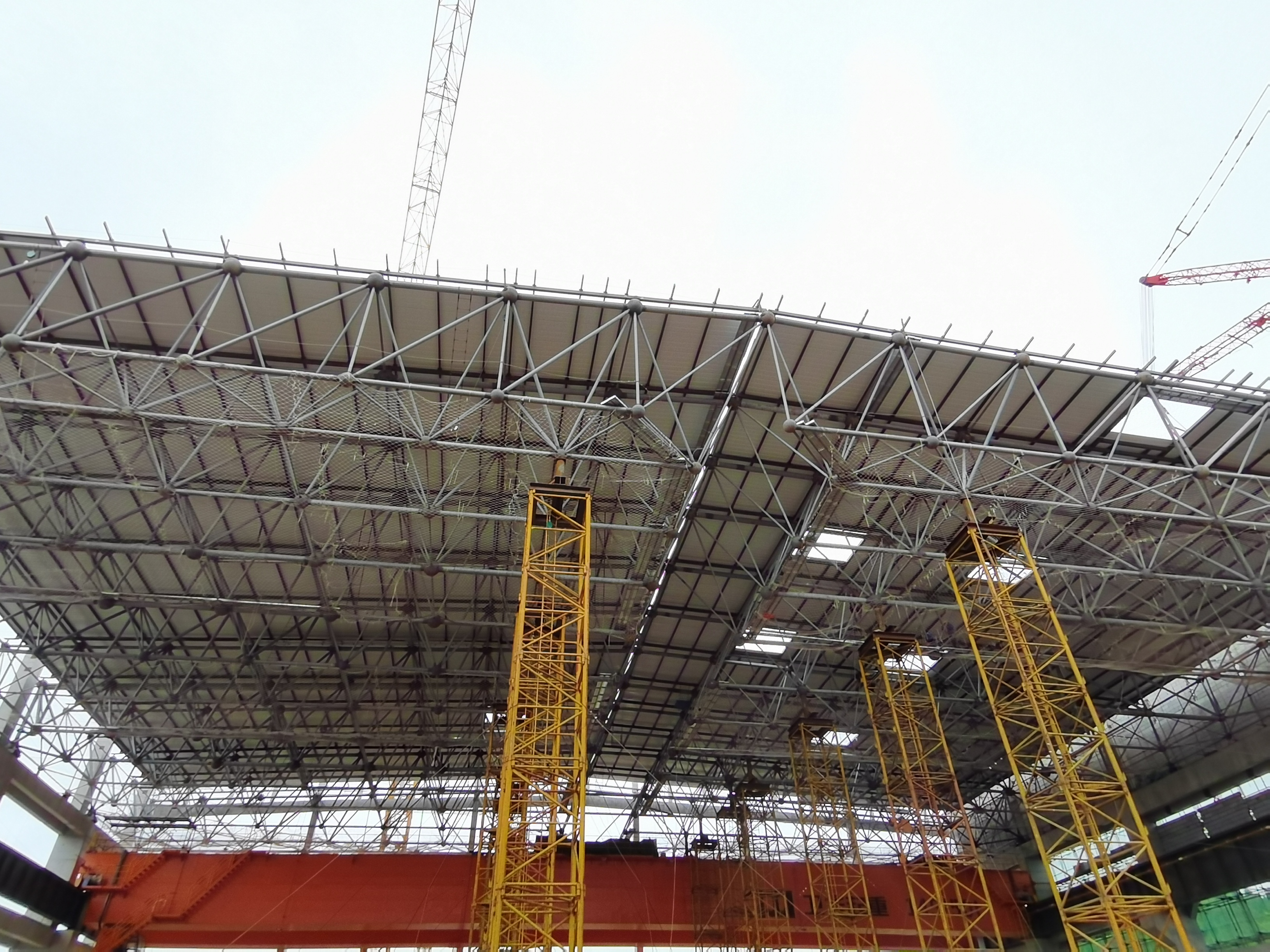 资阳燃气电站主厂房屋面网架标高位于31.65m,主要由焊接球、圆管组成,共分16个分块组合安装,1号机组安装1-8号分块。为确保按时完成止水节点目标任务,参建单位成立专班小组,组建组合队、吊装队、焊接队、拼板队等四个施工小队,现场设置4个组合场、1个拼装场。作业期间,专班小组统一协调,明确各小队分工,科学规划作业顺序,做实做细高空作业安全技术交底和各项措施,确保安装工作有序推进。资阳气电公司、项目监理部专人全程跟踪施工作业过程,牢牢把握安全、质量两个核心,确保安装质量。参建各方克服了近期暴雨天气、高温暑热等不利因素,高质量完成了止水工作。