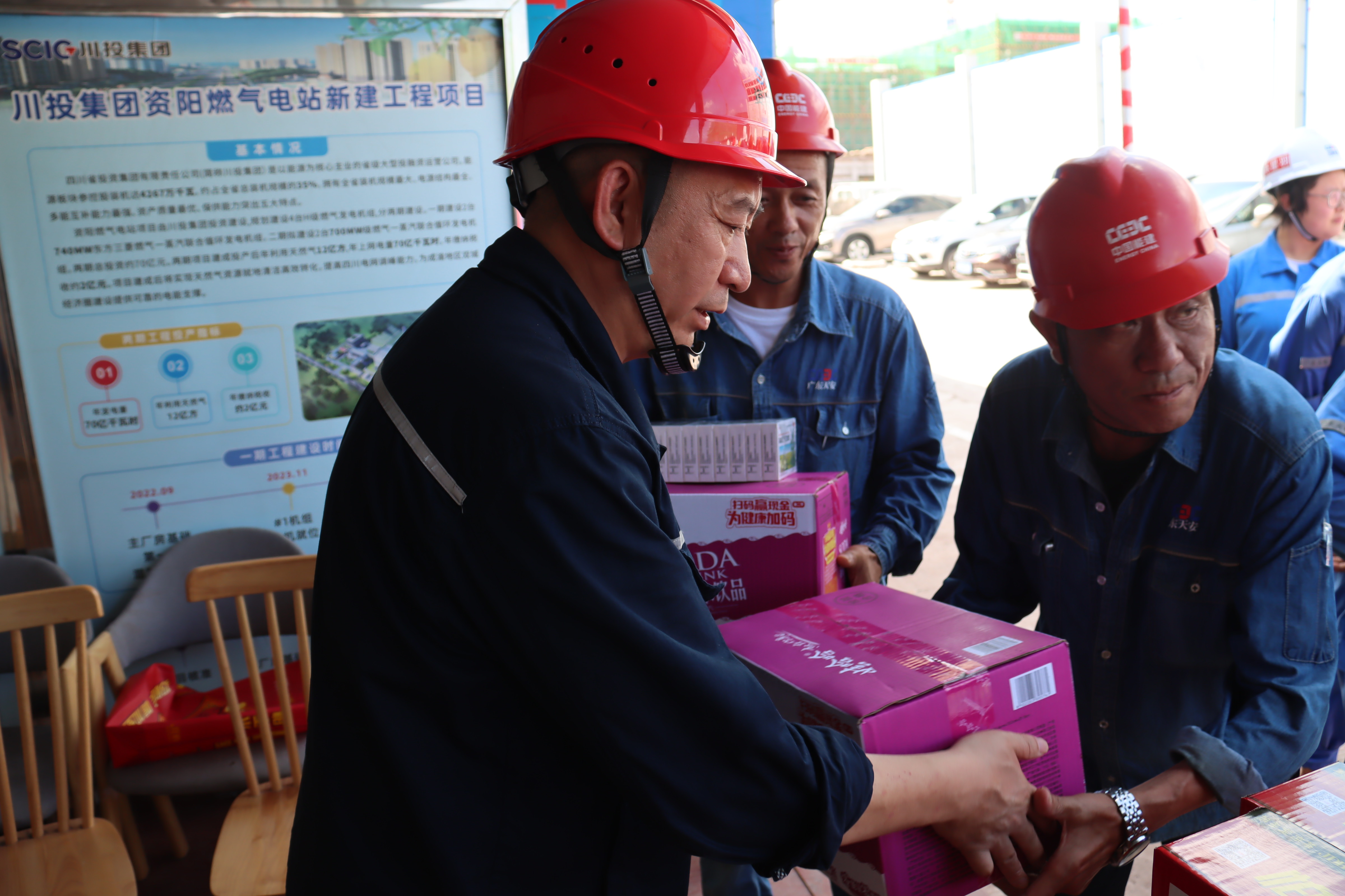 8月10日,党支部书记、执行董事、总经理梁红兵,副总经理、工会主席李明来到资阳燃气电站项目建设现场,为现场施工人员送上加多宝、苏打水、西瓜、藿香正气液等清凉慰问品。梁红兵代表资阳气电公司党政班子、工会对炎炎夏日坚守一线的建设者们表示感谢,他叮嘱工友们一定要注意人身安全,做好保护措施,严防热射病发生,确保安全施工。他要求施工单位一定要提前预判,科学做好错峰施工、汛期施工安排,把人身安全放在首位,制定落实好各项保障措施,确保施工建设者的生命安全。
