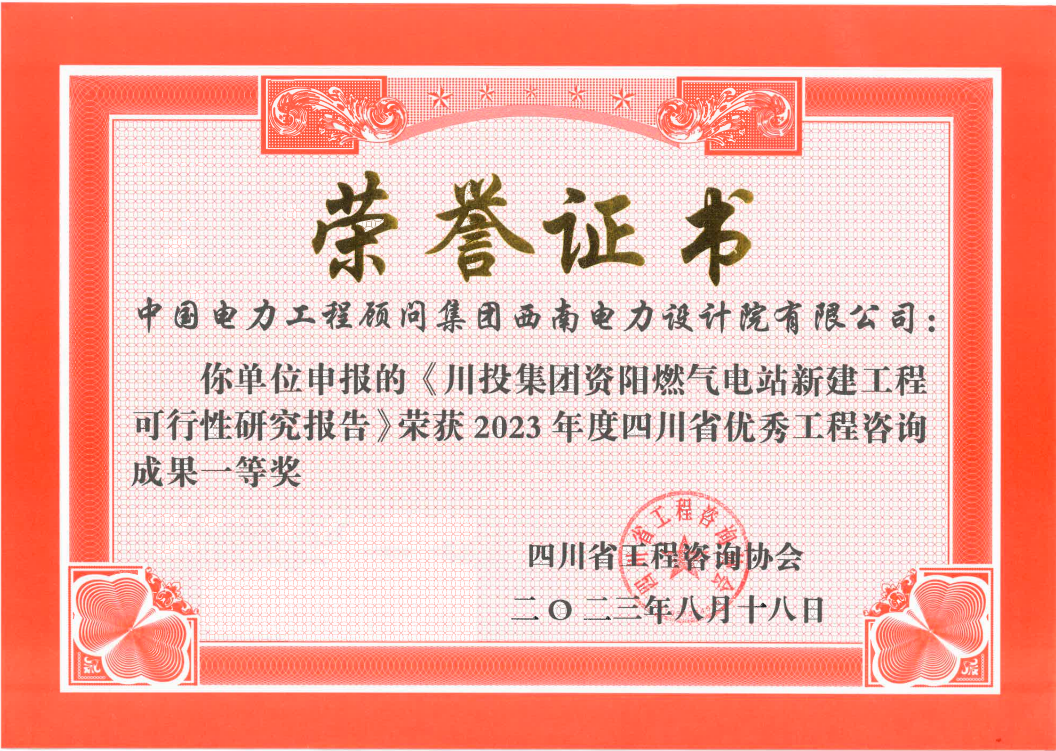 2023年8月18日,四川省工程咨询协会发布了四川省2023年度优秀工程咨询成果评选结果,《川投集团资阳燃气电站新建工程可行性研究报告》荣获四川省优秀工程咨询成果一等奖。