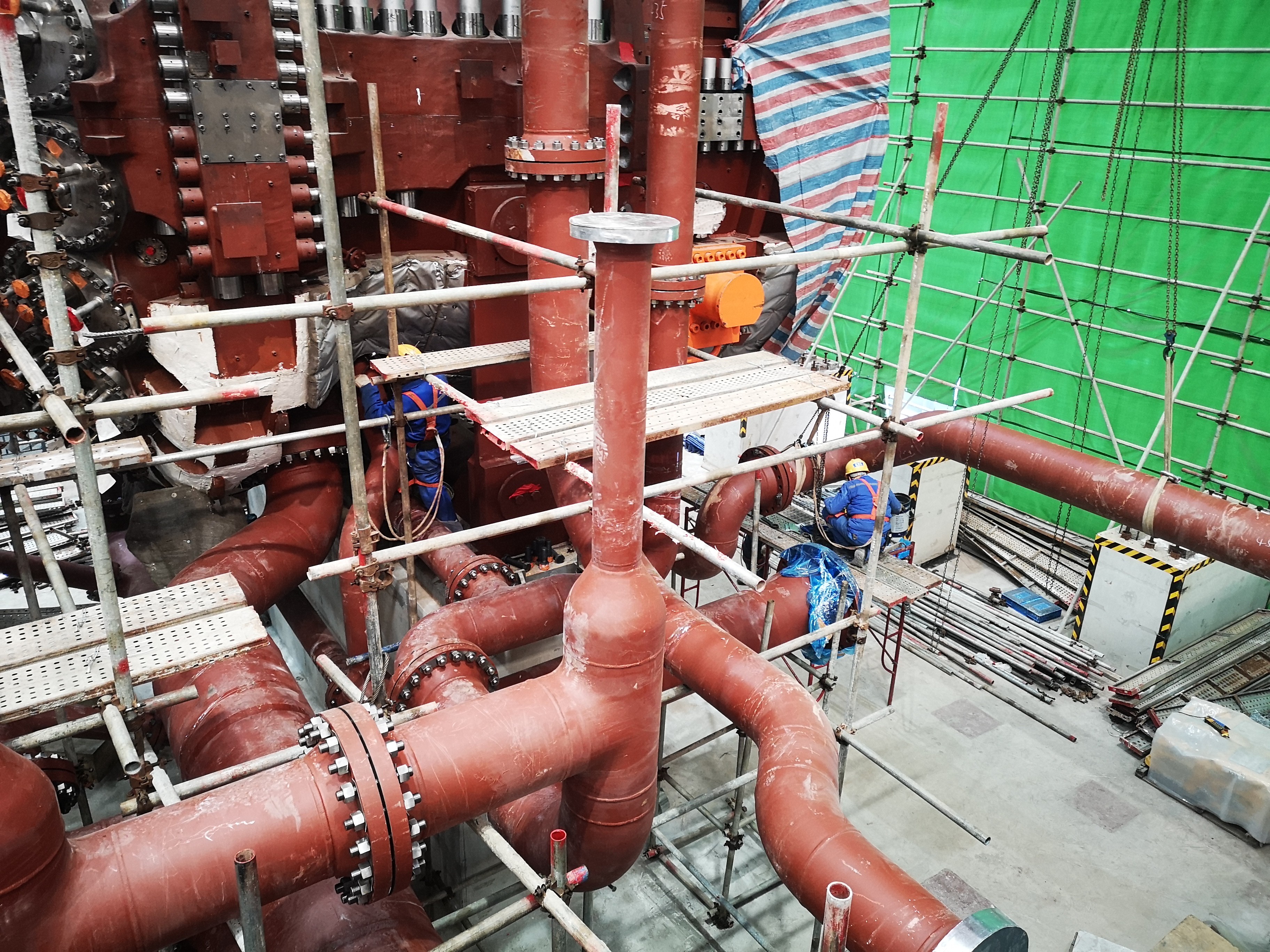 在主厂房区,#1燃机本体管道、凝结水精处理系统、启动锅炉疏放水管道安装以及SFC系统、TCS系统等部位电缆线敷设、接引工作正有条不紊地进行着。在辅助生产区化学制水车间,运行维护人员认真巡检设备,严格按规定对设备进行保养及维护。在智慧管控中心,运行维护人员通过集中控制系统和现场巡检按时检查220kV升压站、220kV普竹一线、普竹二线、#1机6kV母线、#1机UPS及直流系统等带电设备的运行状态,全力确保已投运设备的安全运行,为后续其它设备调试工作有序推进打下坚实基础。