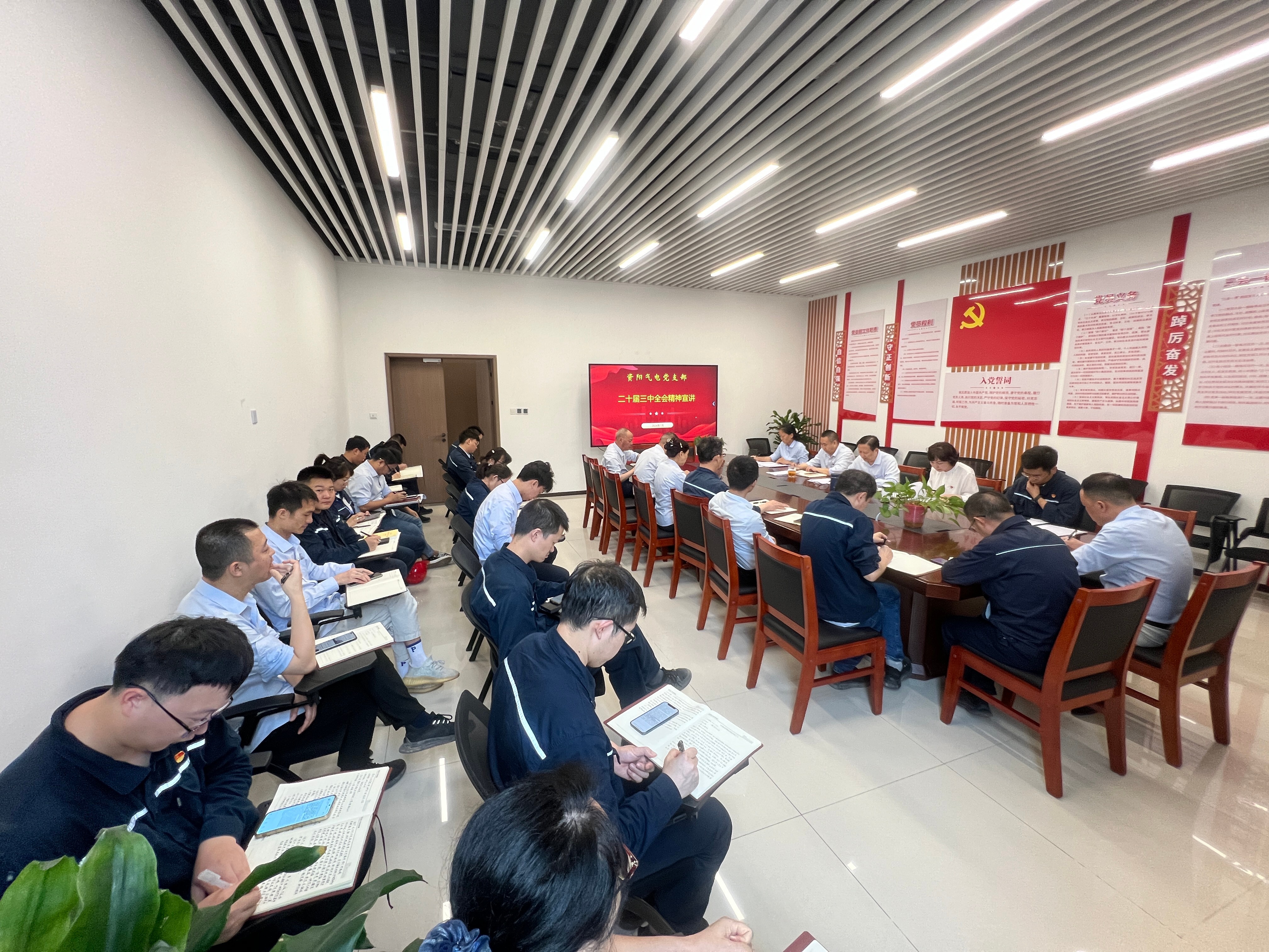 梁红兵着重讲述了党的二十届三中全会召开的重大时代意义和深远历史影响,强调了我们党将改革开放进行到底的坚定决心,深入宣讲党的二十大以来党和国家事业取得的重大成就,习近平总书记关于全面深化改革的一系列新思想、新观点、新论断,习近平总书记在党的二十届三中全会上的重要讲话精神以及全会《决定》提出的进一步全面深化改革重大举措。他强调,学习好贯彻好党的二十届三中全会精神是当前和今后一个时期全党全国的一项重大政治任务,党支部要高度重视,以“三会一课”、主题党日活动等为契机,组织好专题学习和研讨;要广泛运用“一网一微”平台、宣传展板等宣传载体,在公司范围内营造学习贯彻党的二十届全会精神的良好氛围,引导广大党员、群众深刻领悟“两个确立”的决定性意义,增强“四个意识”、坚定“四个自信”、做到“两个维护”,切实把思想和行动统一到党中央决策部署上来。他要求全体党员要端正学风、改进作风,在“学”“做”方面带好头,不断增强学习的主动性和自觉性,努力把党的二十届三中全会精神学懂弄通,要增强党员意识,加强党性修养,在公司各项工作中主动作为,发挥好模范带头作用。他指出,2024年是资阳燃气电站项目建设收官年,工程建设、生产经营工作任务重、压力大,公司上下要以学习贯彻党的二十届三中全会精神凝聚动力、激发活力,顽强拼搏,全面推动全年各项工作目标圆满完成。
