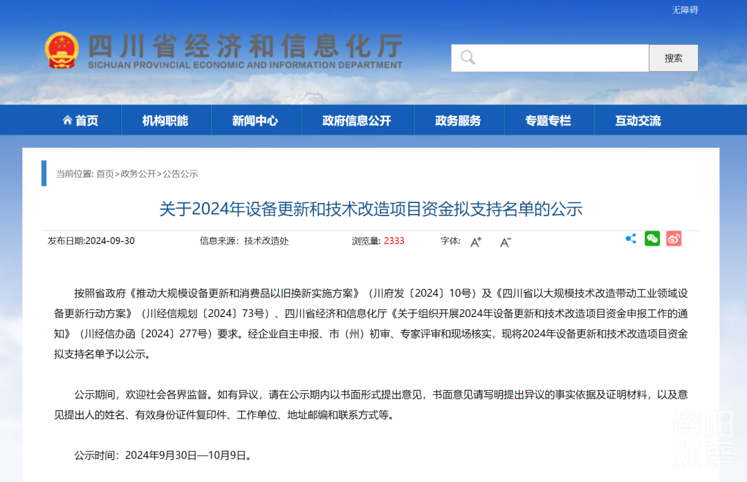 10月9日,川投集团资阳燃气电站新建工程项目顺利通过四川省经信厅官网公示期,喜获省经信厅2024年设备更新和技术改造项目资金支持。