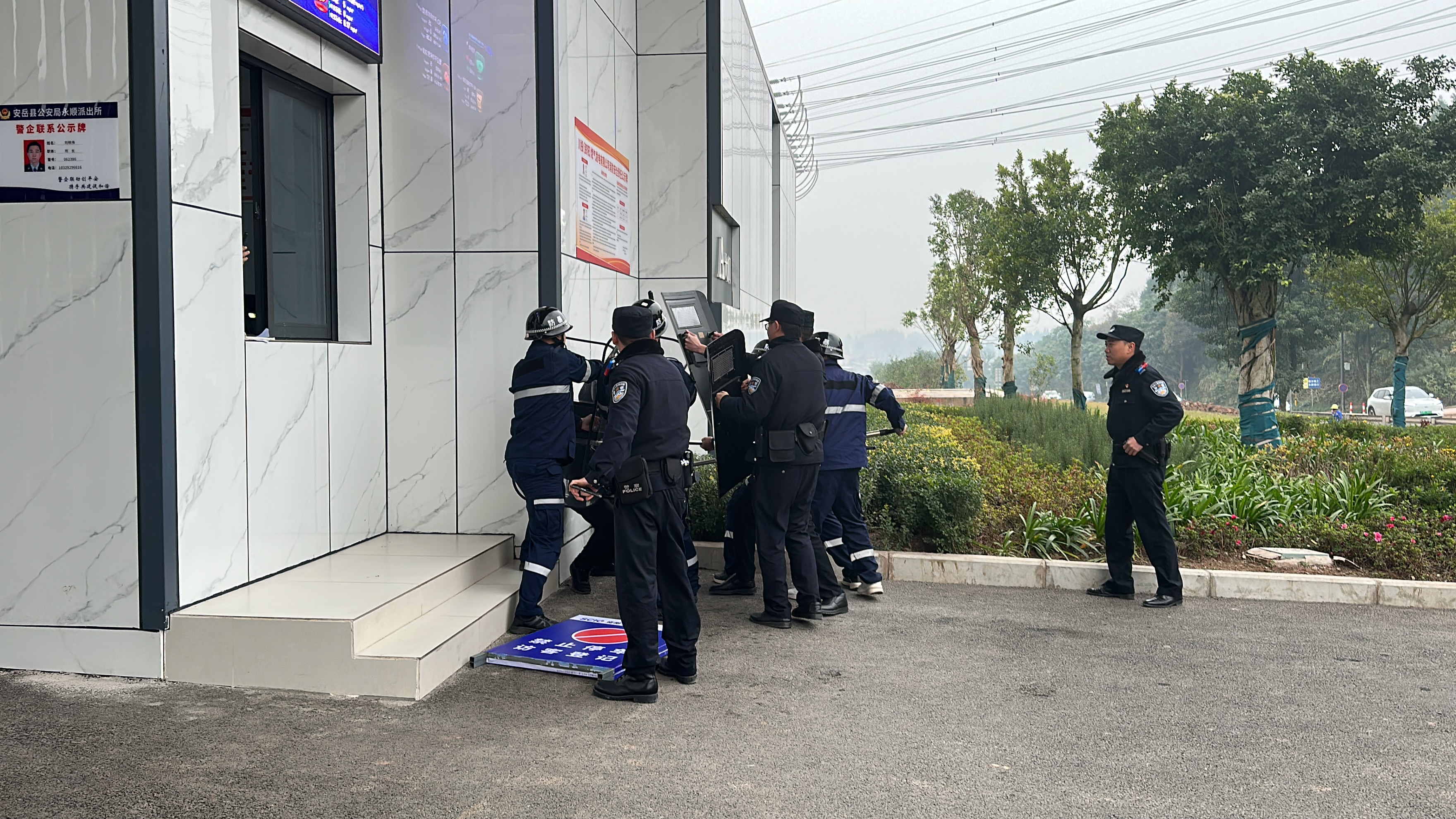 指挥中心迅速响应,启动反恐应急预案,各应急小组快速赶赴现场,并拨打辖区派出所报警电话报警。应急防暴小组迅速行动,手持防暴器械,形成防御队形,与“暴力分子”展开周旋。按照日常训练要求,采取“分隔处置,制服首要分子”的原则,迅速制服了首要“暴力分子”,有效阻止了“暴力分子”的进一步攻击。辖区安岳县永顺派出所出警迅速,5分钟到达演练地点,接管“暴力分子”,完成移交,整个警企联动有条不紊,演练达到预期效果。