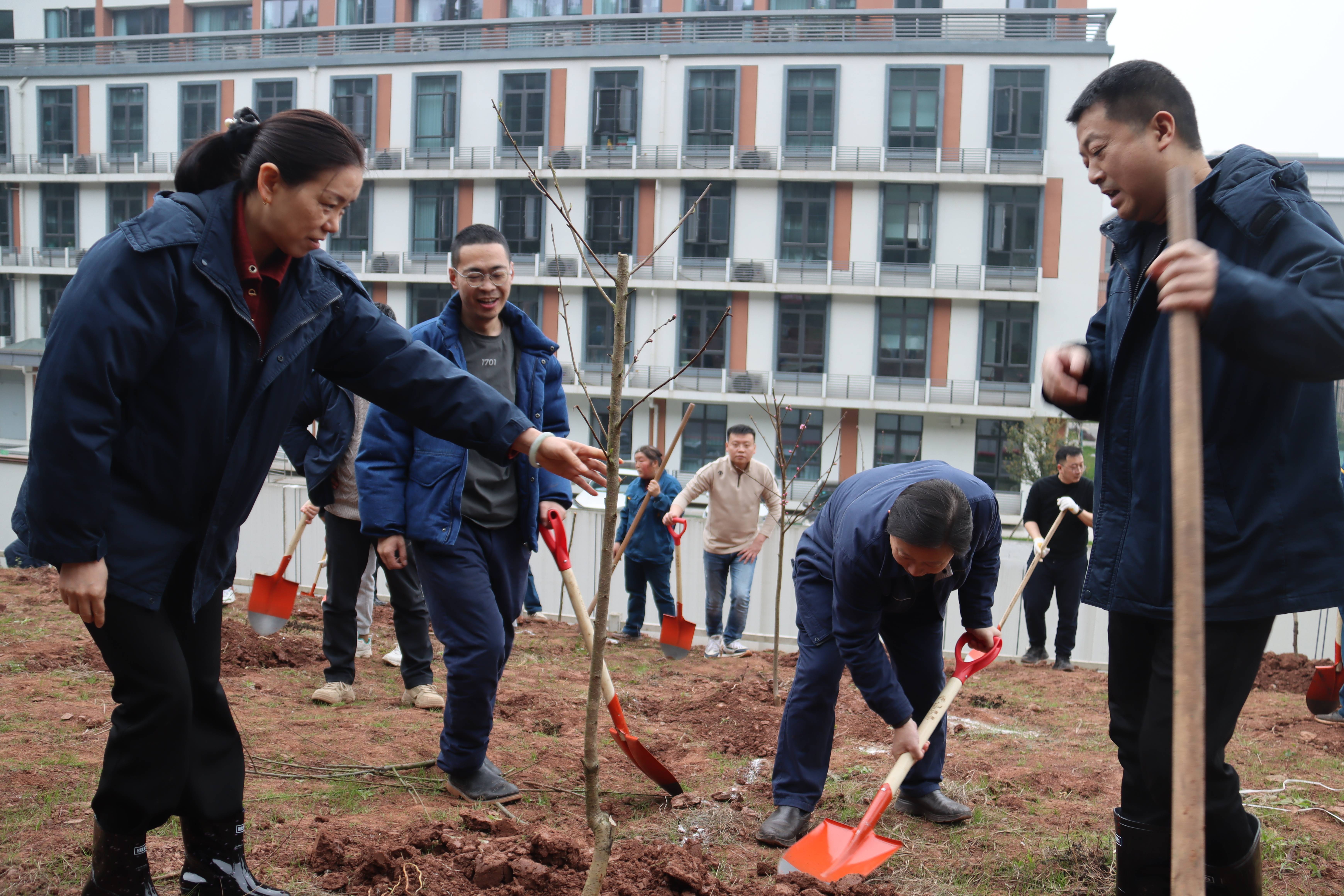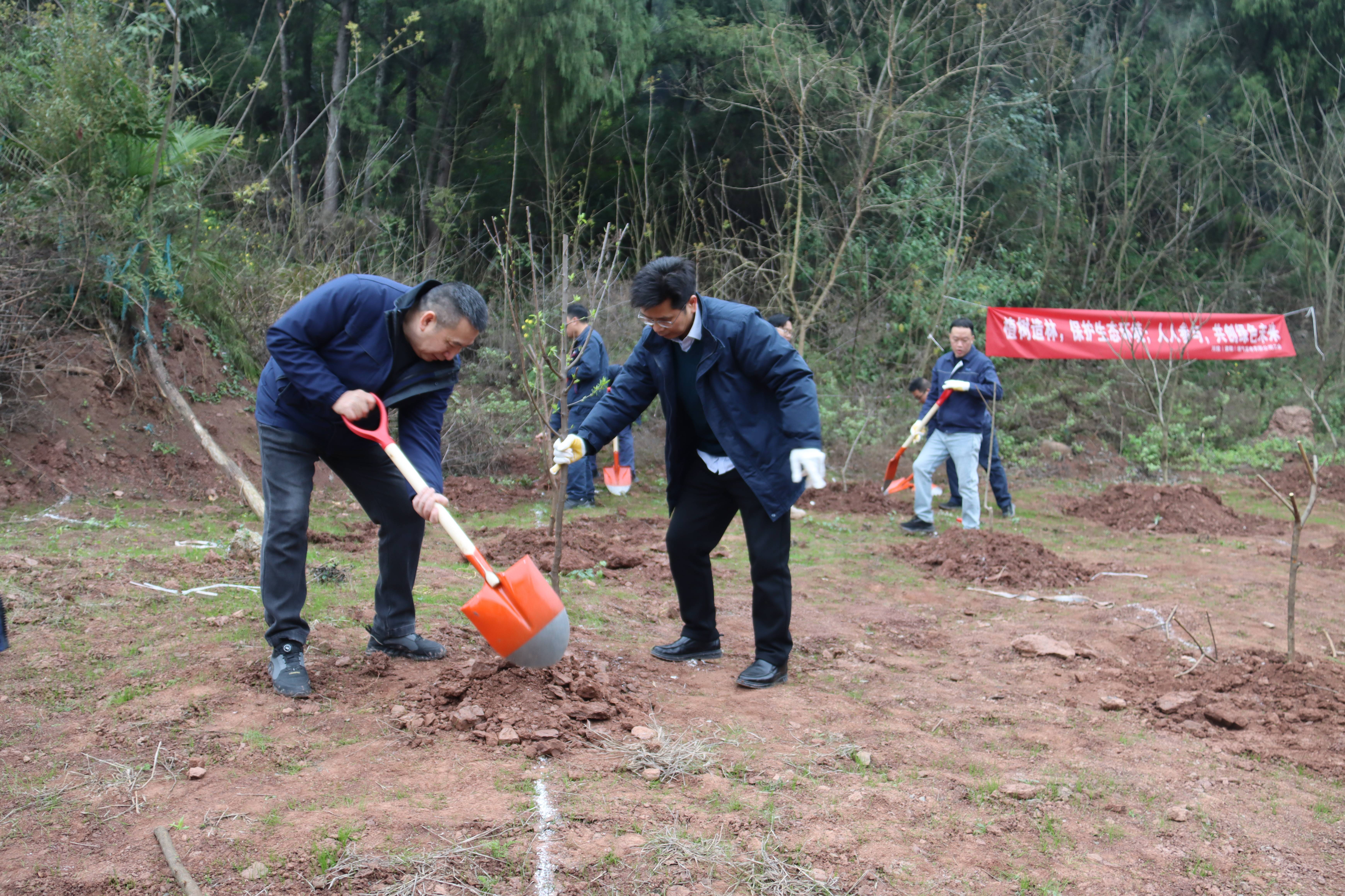 上午9时,植树活动正式启动。领导班子带头挥锹,与员工们分组协作,挖坑、扶苗、培土、浇水,每一道工序都细致认真。在专业人员的指导下,大家将一株株桃树、李树幼苗栽种于厂外边坡之上。新栽的树苗整齐排列,与厂房交相辉映,形成一道靓丽的生态风景线。