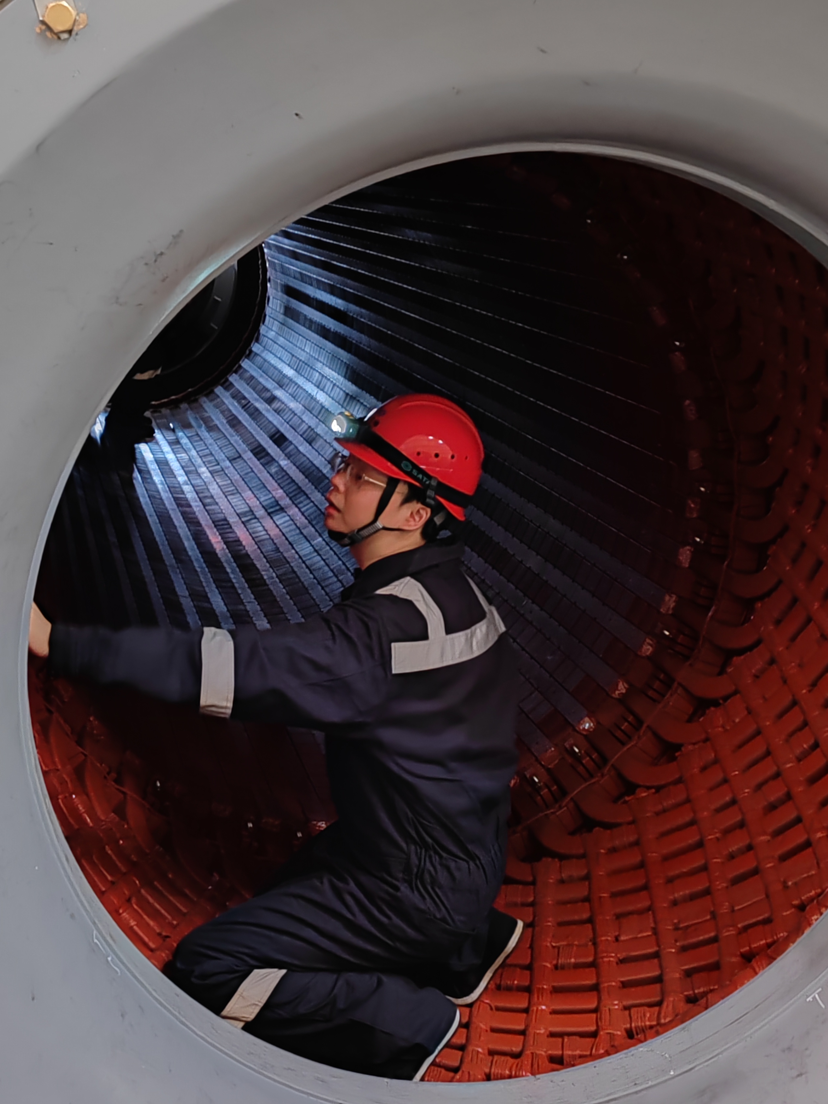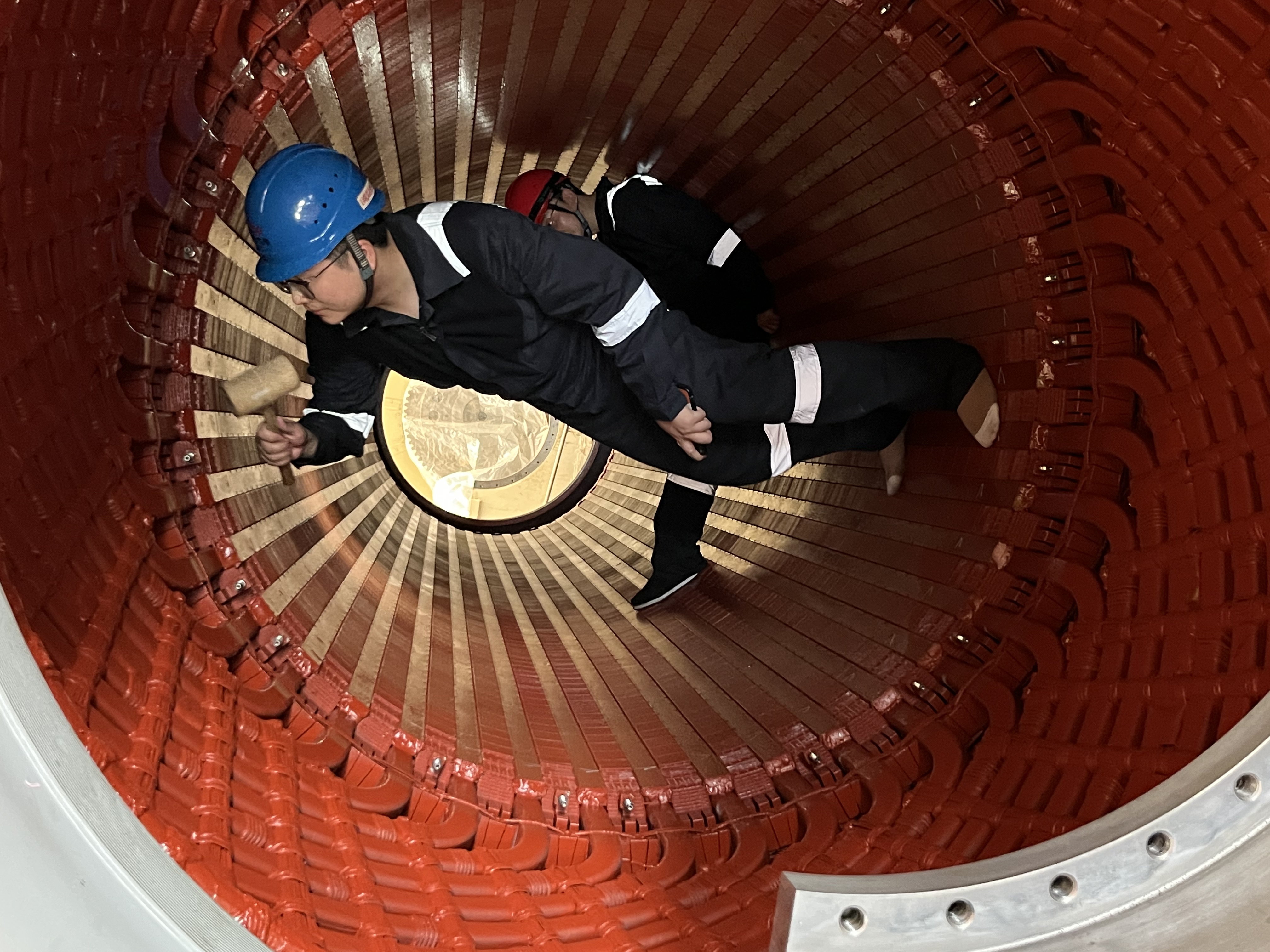 此次检查聚焦发电机组核心设备可靠性,重点对定子绕组、铁芯、端部绑线等关键部位开展全面排查,通过测量绝缘电阻和直流电阻精准评估绕组绝缘性能,确保无匝间短路隐患。技术人员同步对定子槽楔进行逐项检查,确认无松动脱落现象,并对发电机端部定子线棒支架、手包绝缘等部件进行结构稳定性与绝缘性能双重验证,确保设备整体状态符合运行标准。